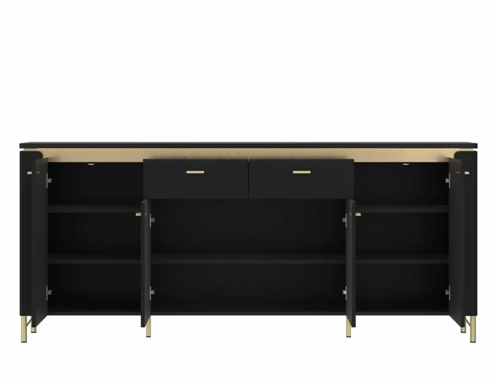 Caisson: ton noir et contrastes ton doré, plateau en MDF, panneau de particules surfacé mélaminé (PPSM)
