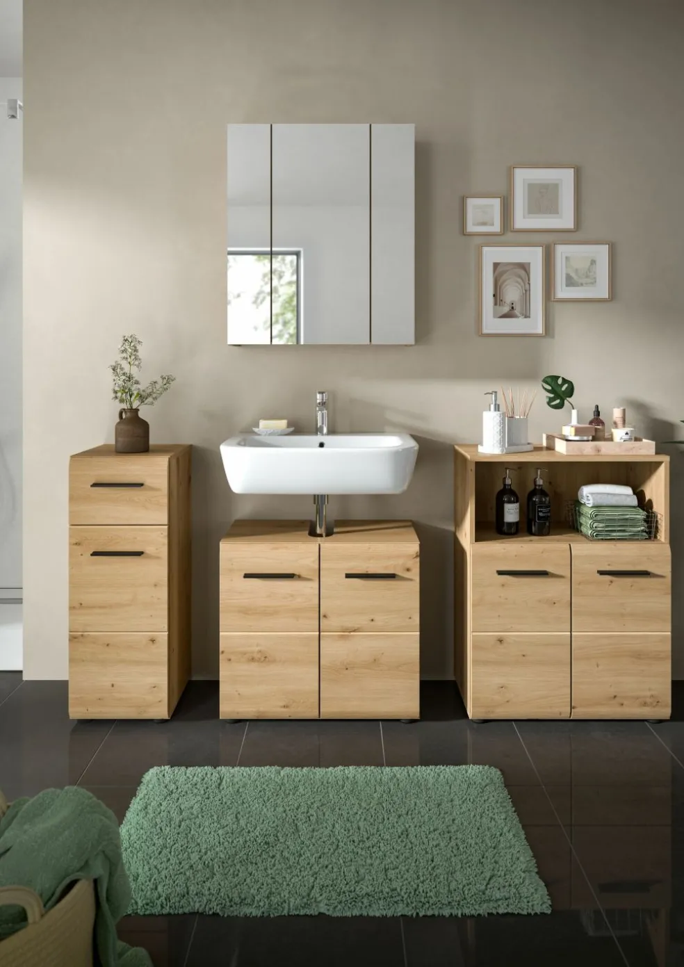1 meuble de salle de bains avec 1 casier ouvert, 2 portes et 1 tablette amovible