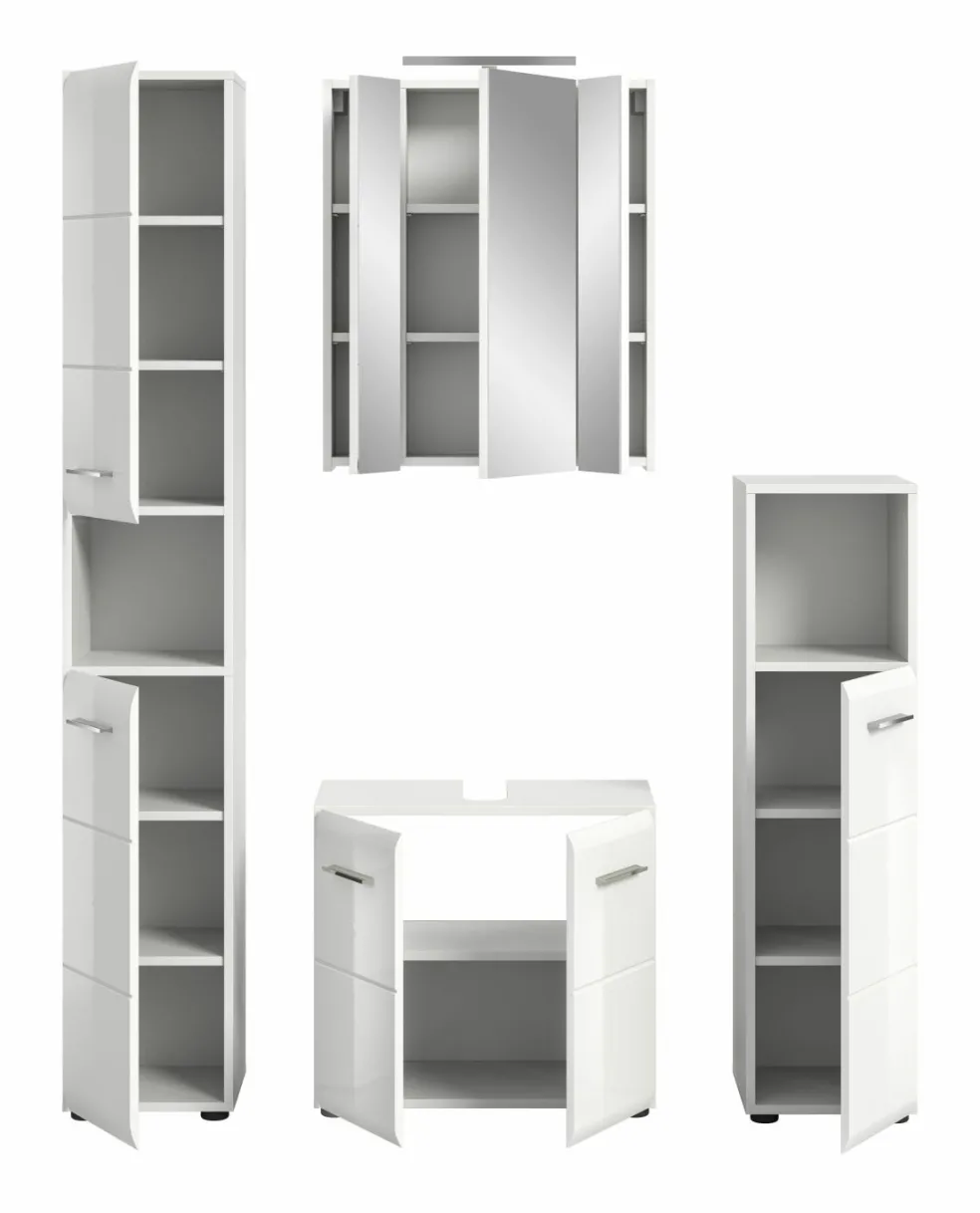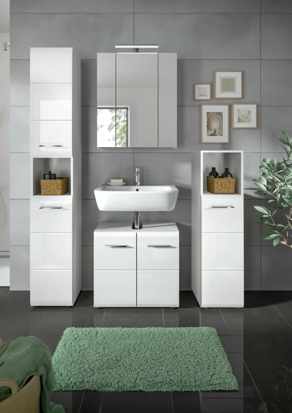 1 colonne de salle de bains avec 2 portes, 4 tablettes amovibles et 1 casier ouvert