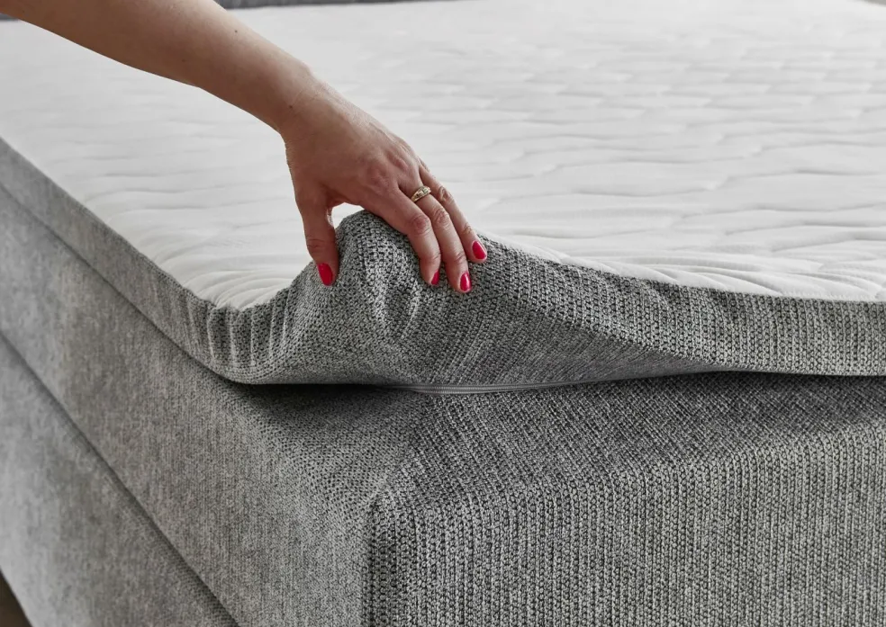 Surmatelas continu en mousse PU confort d’environ 6 cm (25 kg/m³), avec profil alveole sur un cote (pour modifier le confort de couchage, le surmatelas peut etre retourne a l’interieur de la housse