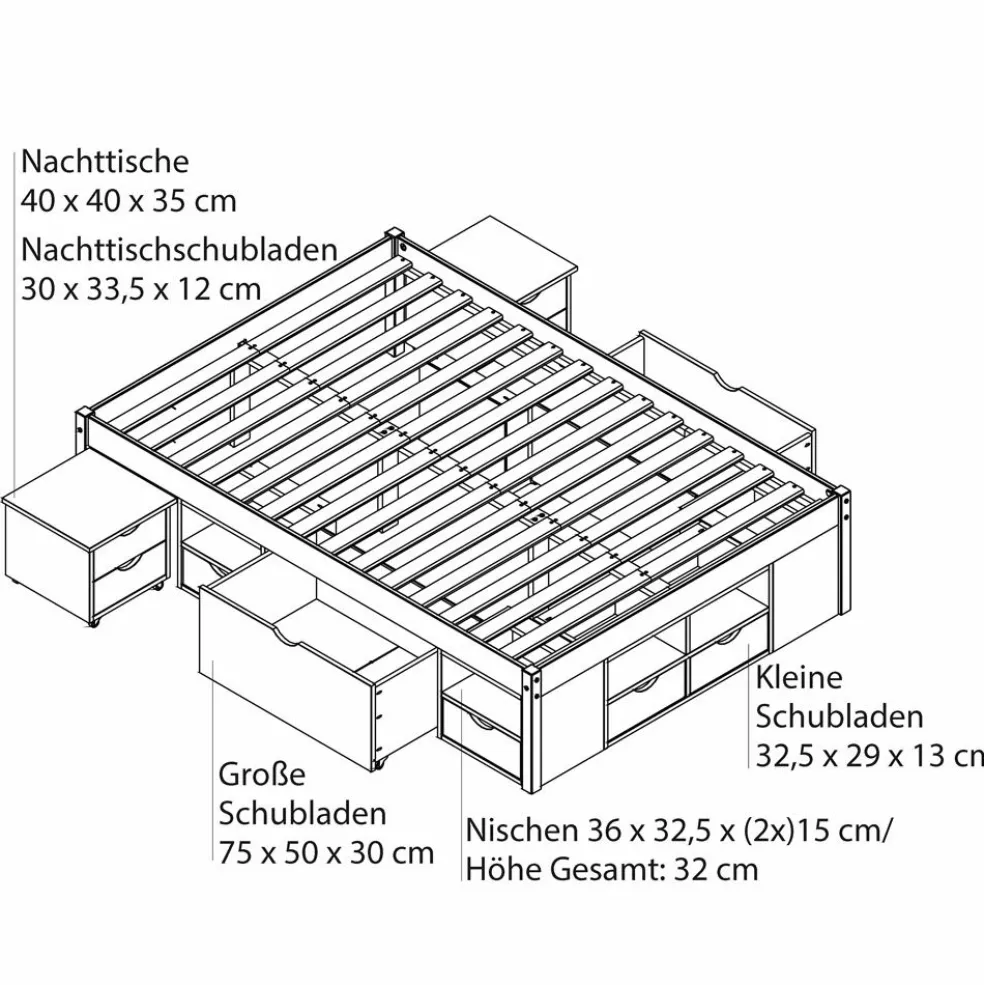 | Equipement lits: | Tiroirs, incl. chevet(s), incl. sommier à lattes , sans tête de lit | ||