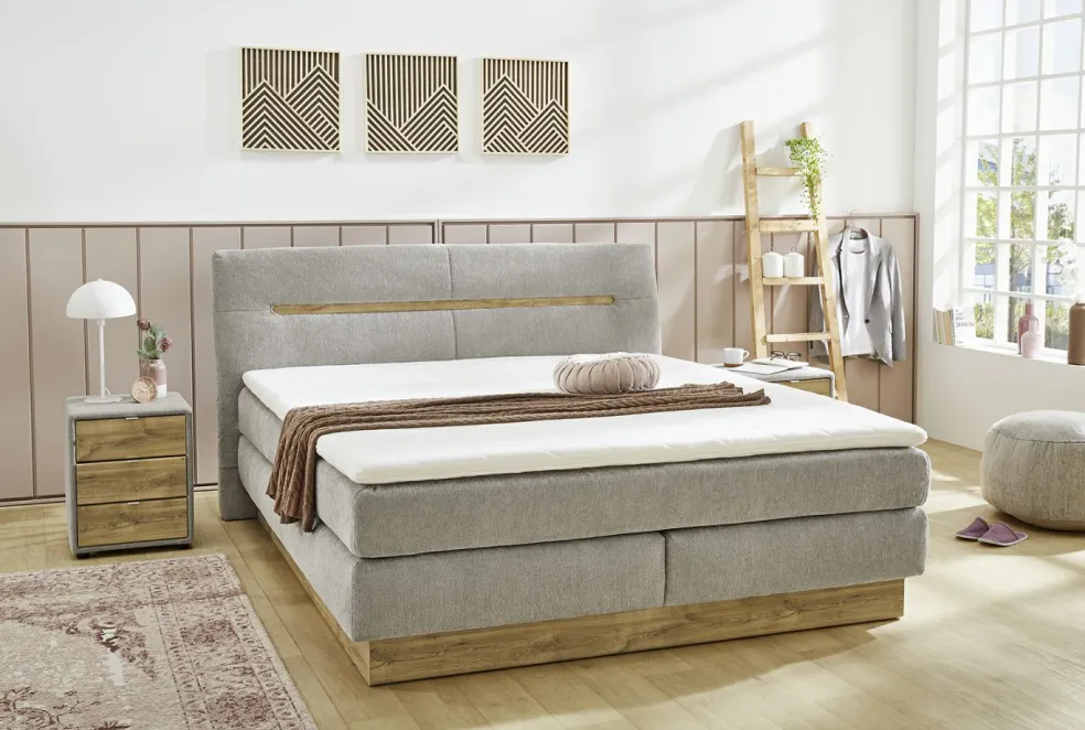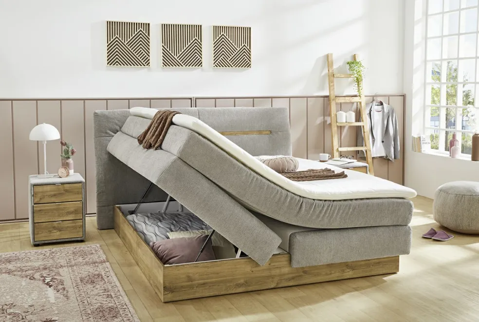 Nika associe un design tendance et naturel avec un aspect pratique indéniable. La combinaison harmonieuse entre le bois et une sélection de tissus permettra de créer une oasis de bien-être dans votre chambre à coucher. Le coffre de rangement facile à ouvrir à l’aide d’un vérin à gaz offre un bel espace pour stocker votre linge de lit de saison.