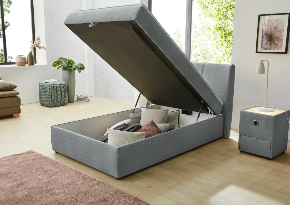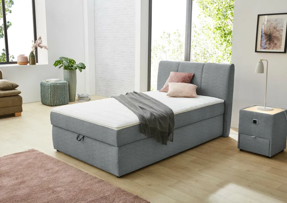 Ce lit rembourré se compose à la base d’un garnissage à ressorts bonnell. La partie supérieure de ce lit garantissant une excellente expérience de couchage est constituée d’un surmatelas en mousse polyuréthane intégré de manière fixe ce qui l’empêche de glisser.