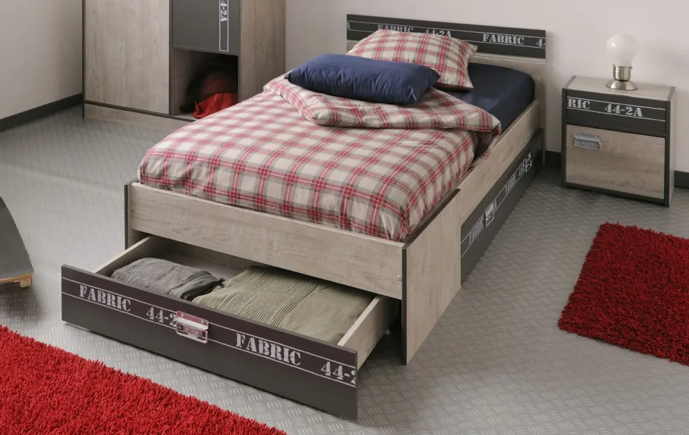 Le lit d’ado FABRIC 3 marque des points par son design ultra cool, sa finition d’excellente qualité et sa capacité à créer une atmosphère tendance et agréable. Trois tiroirs de lit et un chevet offrent un vaste espace de rangement.