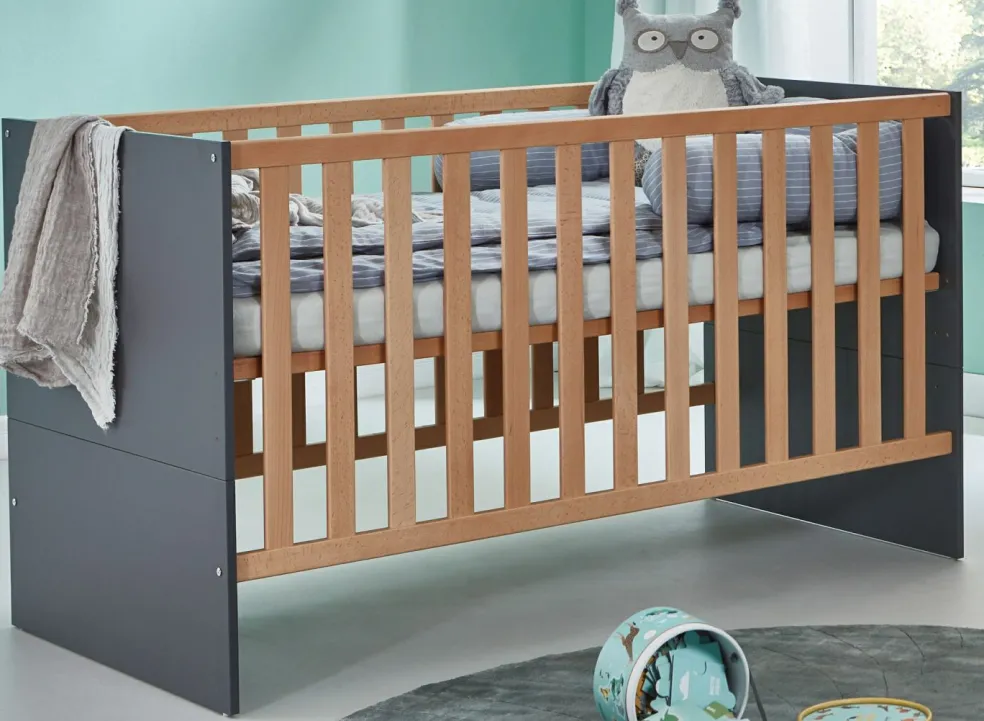 1 lit de bébé avec sommier à lattes réglable sur 4 niveaux; tête de lit et pied de lit en deux parties; grilles latérales avec barreaux plats dont une avec 3 barreaux amovibles