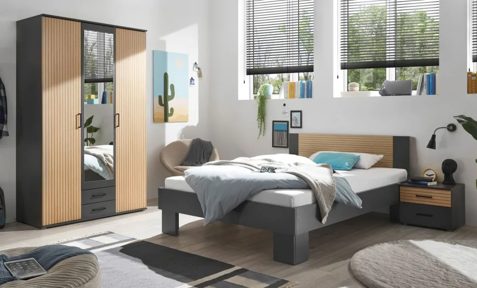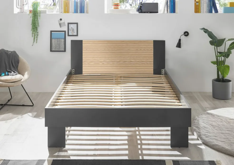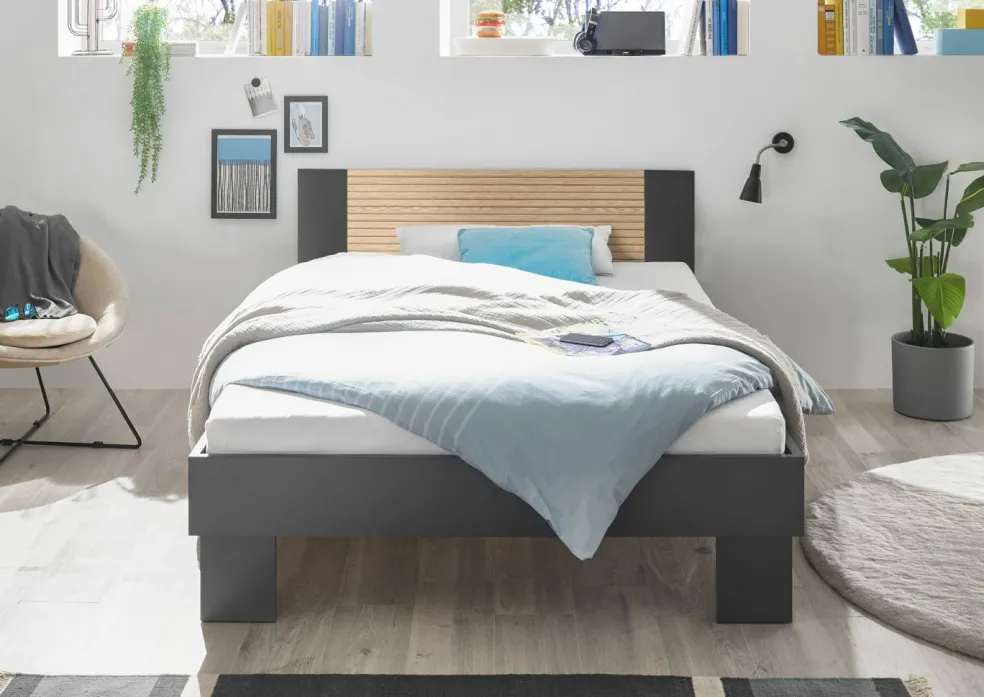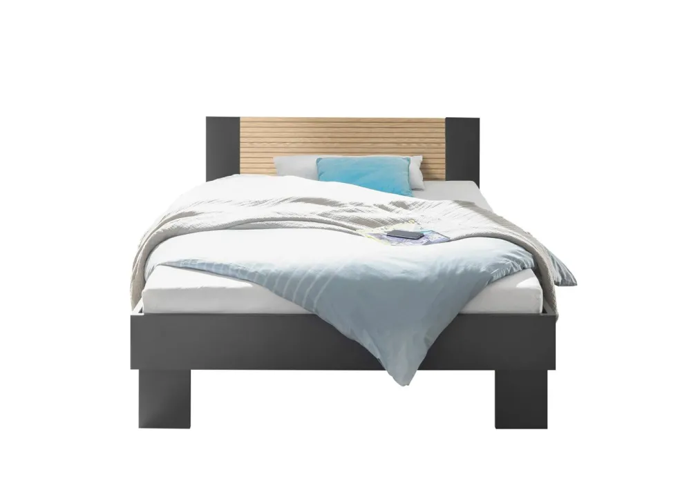 ton graphite avec tête de lit décor lamelles de chêne, revêtement mélaminé
