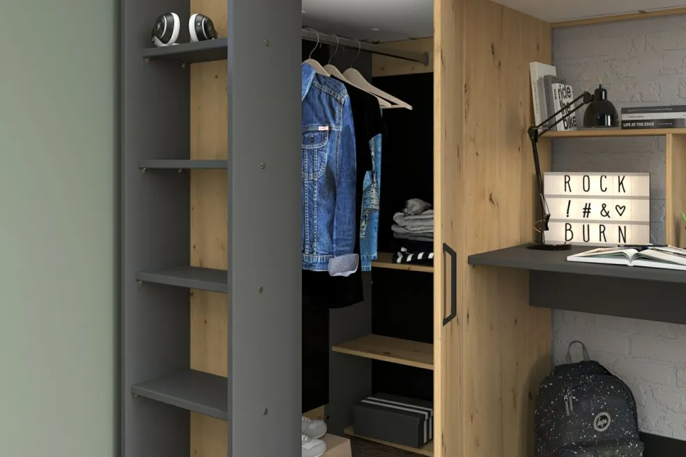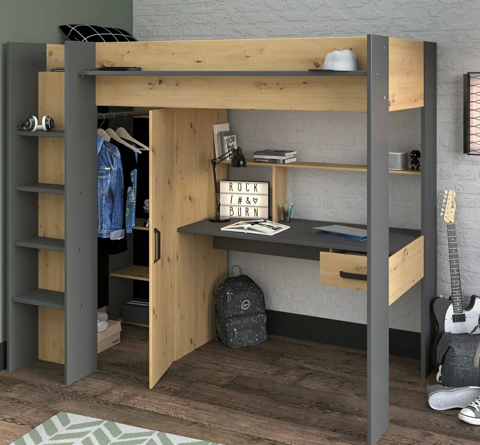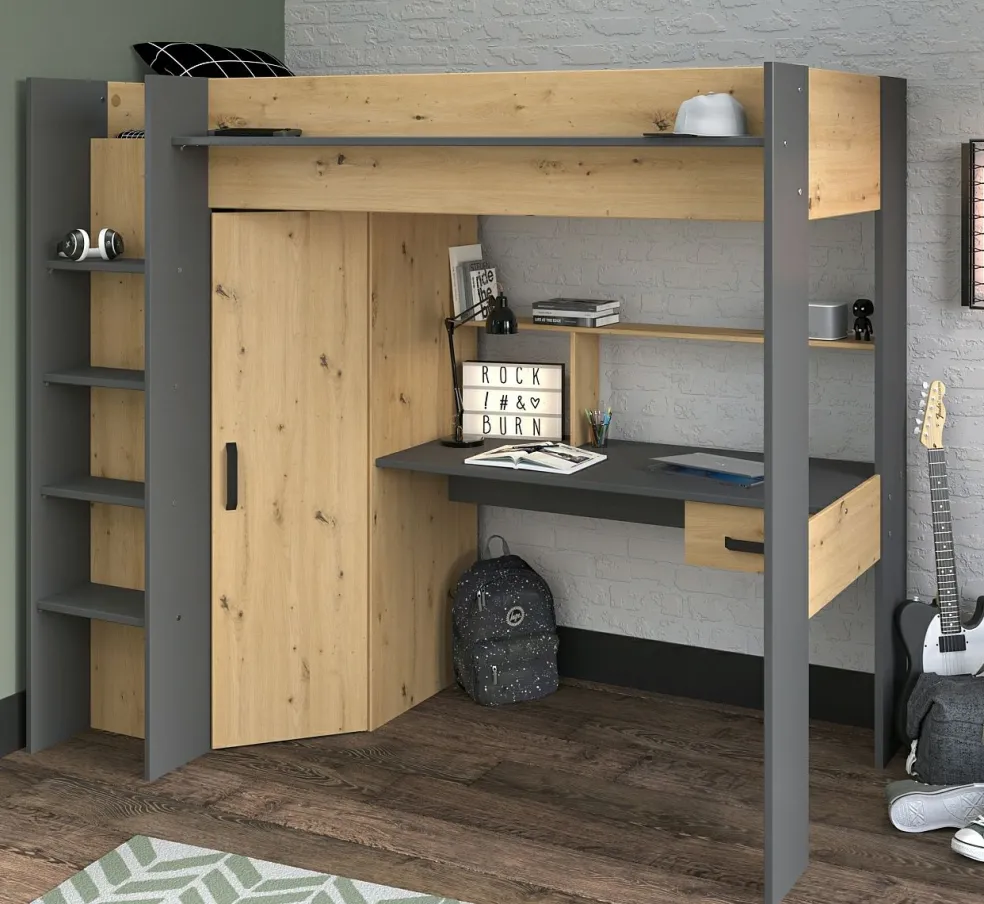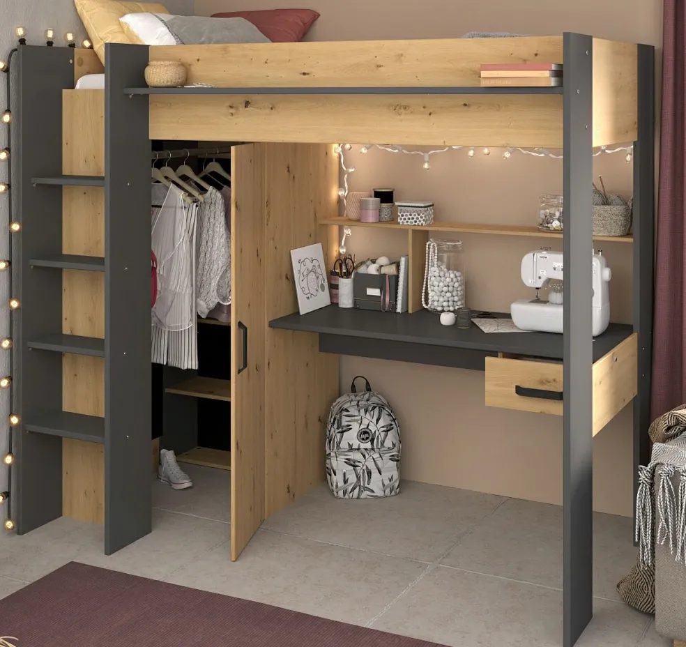 1 bureau intégré (à droite sous la surface de couchage) avec 1 grand plan de travail, surfaces de rangement et 1 tiroir