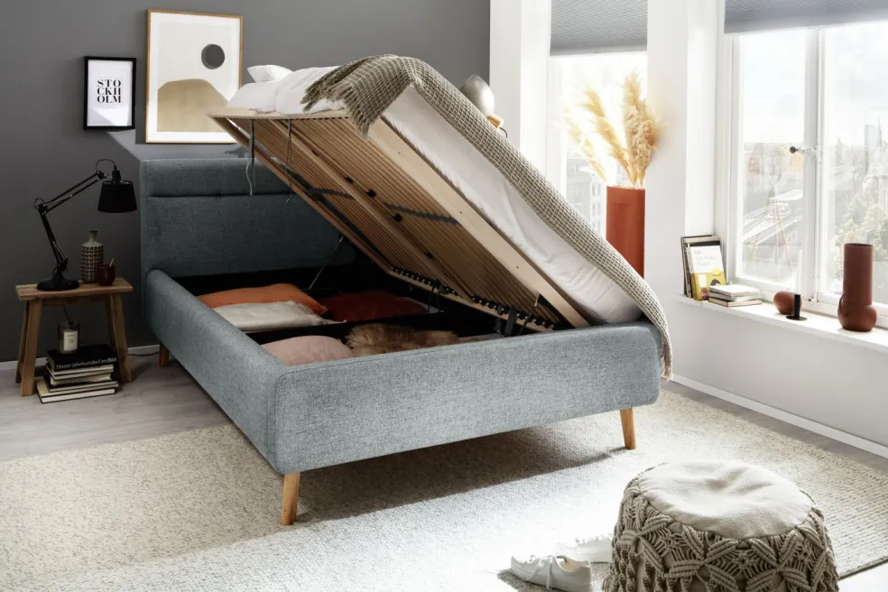 Inclus: coffre de lit avec aération et sommiers à lattes en bois multiplis avec ouverture latérale
