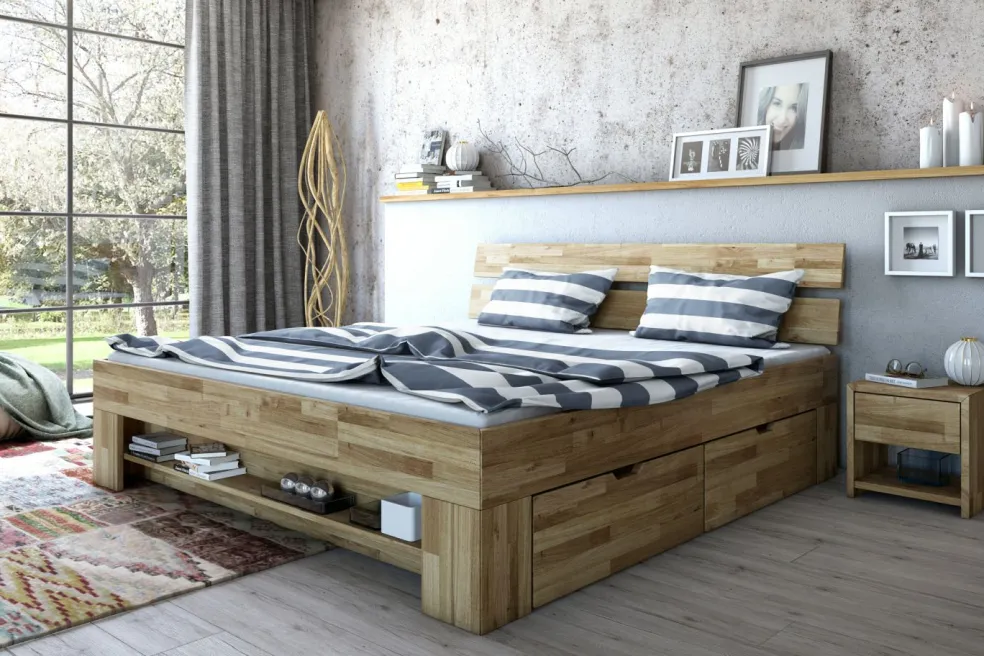 Inclus: 4 tiroirs de lit et une étagère au pied du lit