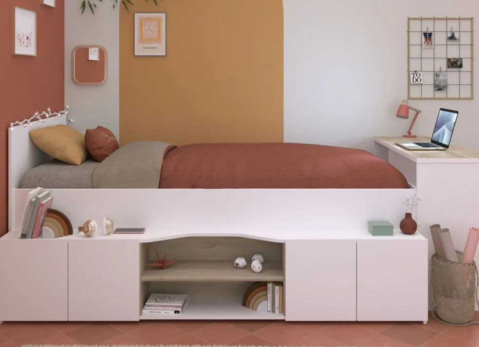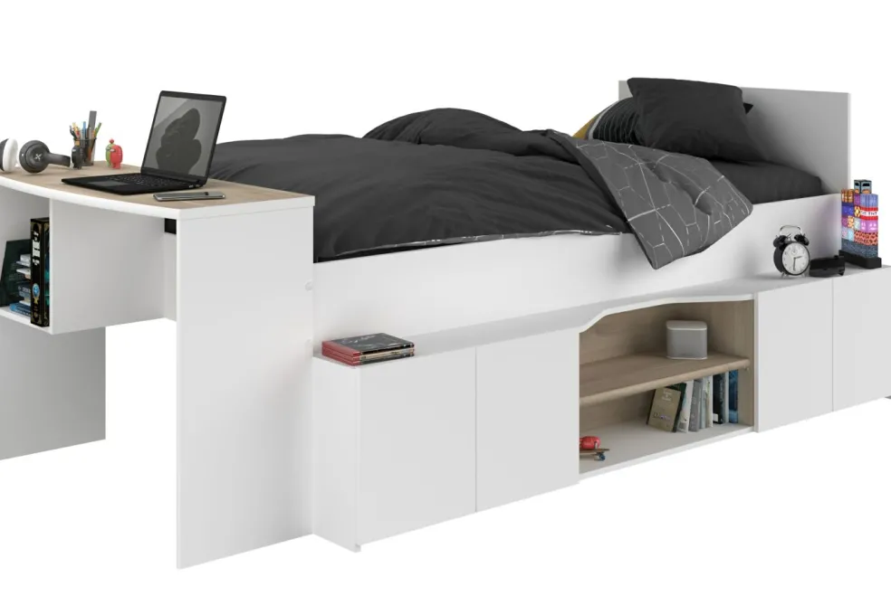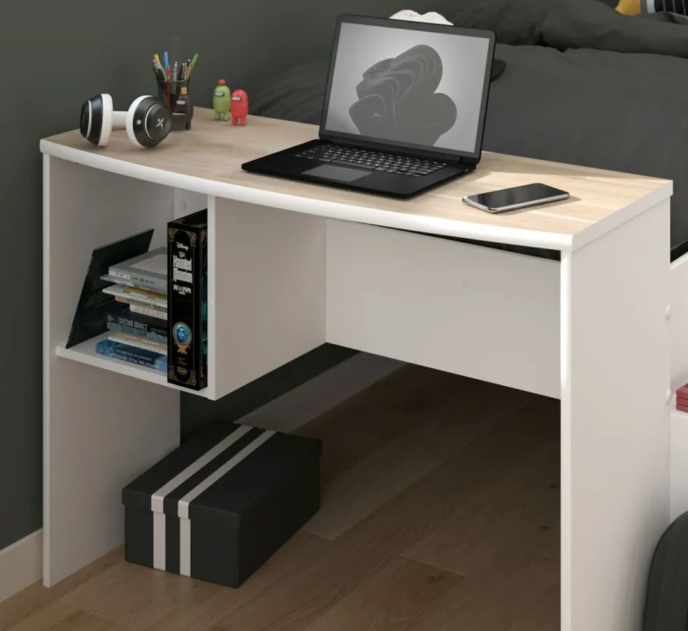 Bureau intégré au pied du lit avec casier de rangement ouvert (pouvant être monté des deux côtés)