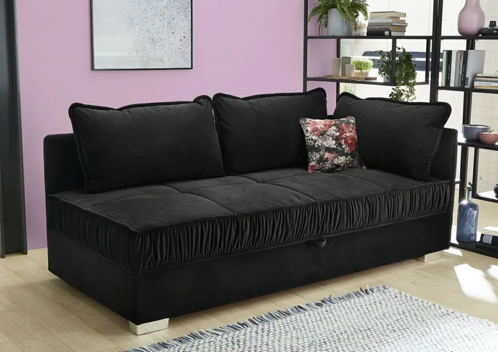 Revêtement: corps et coussins de dos en tissu imitation velours ton noir 100% polyester; coussins décoratifs en tissu 100% coton imprimé avec motif floral