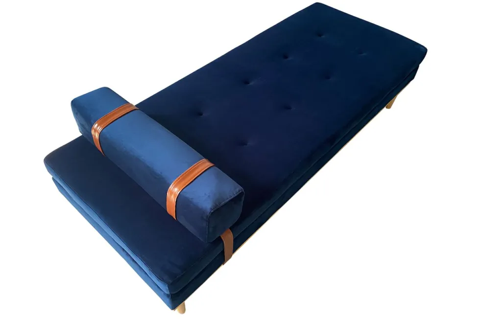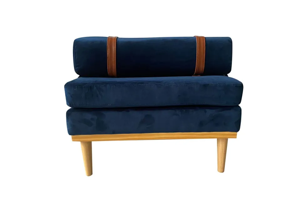 Revêtement : tissu velours ton bleu 100% polyester avec contrastes en cuir synthétique marron 100% polyuréthane