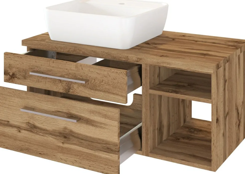 1 meuble sous vasque avec 1 tiroir bas et 1 tiroir haut avec fermeture amortie et 2 casiers ouverts, incl. découpe siphon