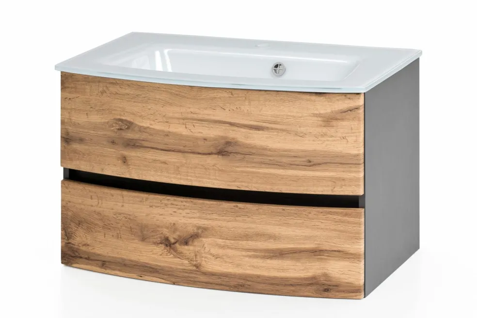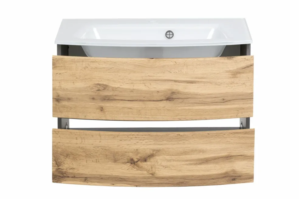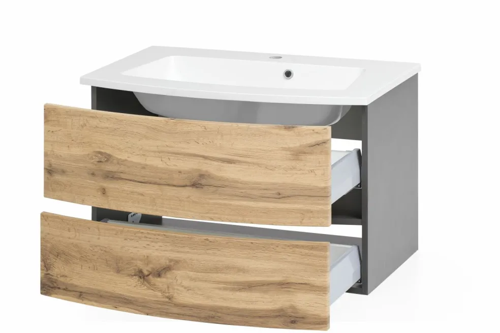 1 meuble sous vasque avec 2 tiroirs en métal à sortie totale avec fermeture amortie, façades arrondies
