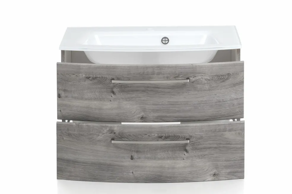 1 meuble sous vasque avec 2 tiroirs à fermeture amortie (à sortie totale), tiroir inférieur avec barres latérales, avec façades arrondies