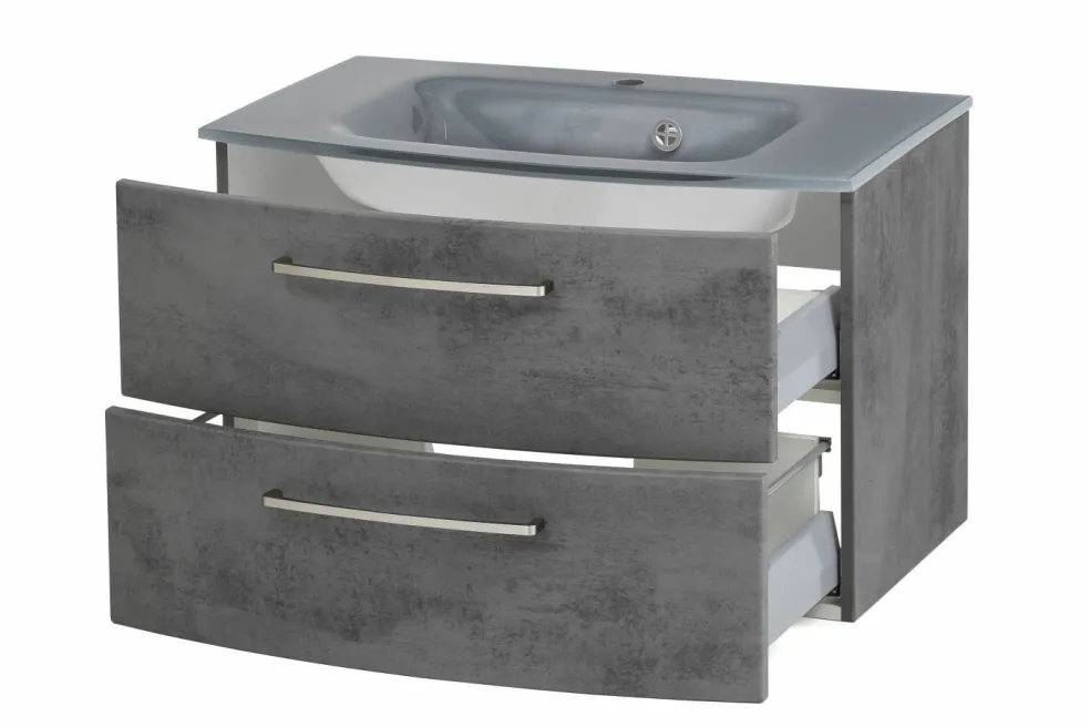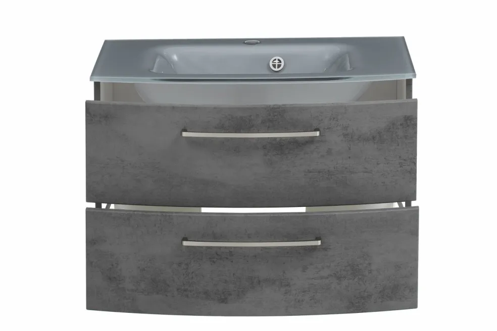 1 meuble sous vasque avec 2 tiroirs à fermeture amortie (à sortie totale), tiroir inférieur avec barres latérales, avec façades arrondies