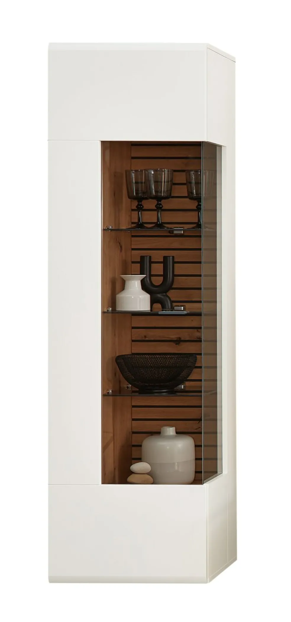 1 meuble haut vitrine avec 1 porte partiellement vitrée, 2 tablettes fixes, 3 tablettes et 3 tablettes en verre