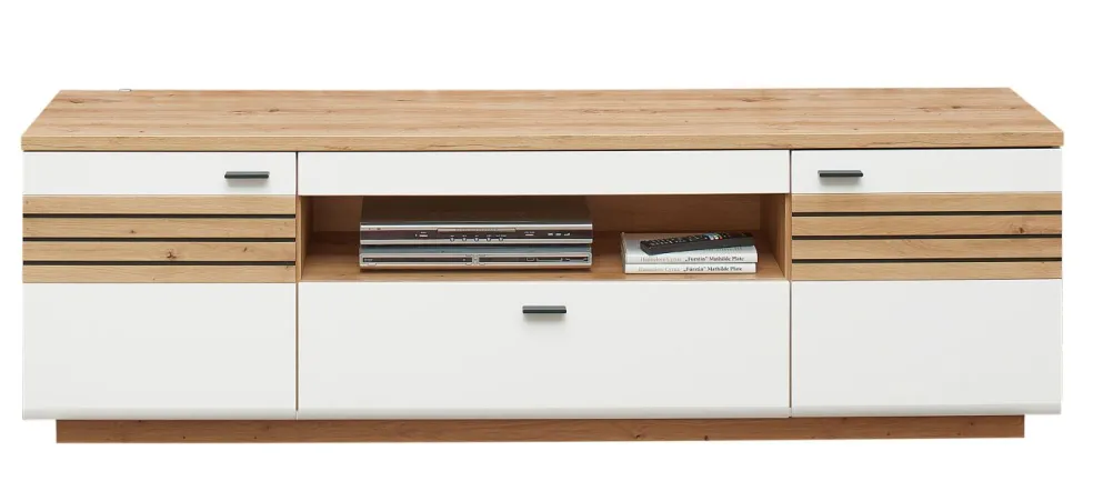 1 banc TV avec 2 portes, 1 tiroir, 1 casier ouvert et 1 passe-câble