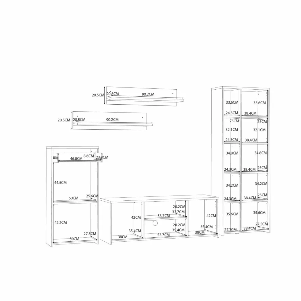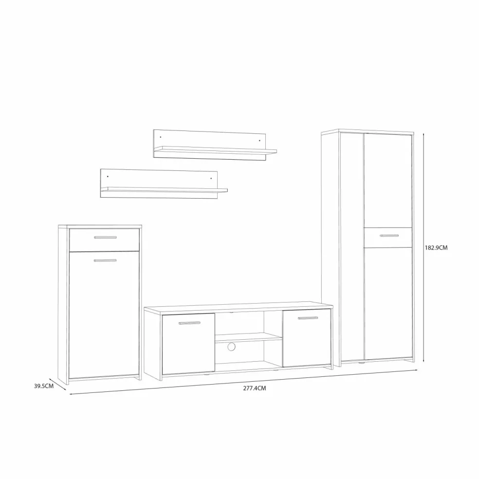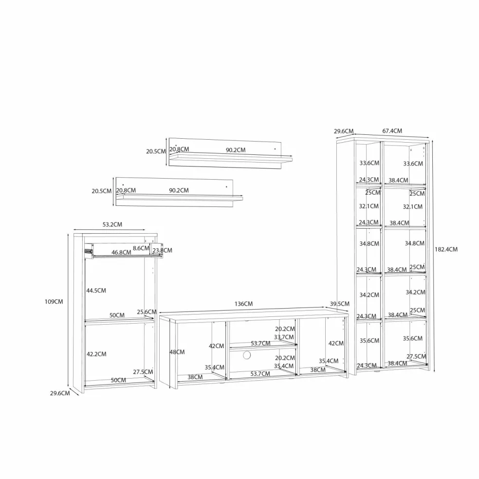 | Equipement murs TV: | Casiers ouverts, Passe-câbles, Tiroirs | ||
