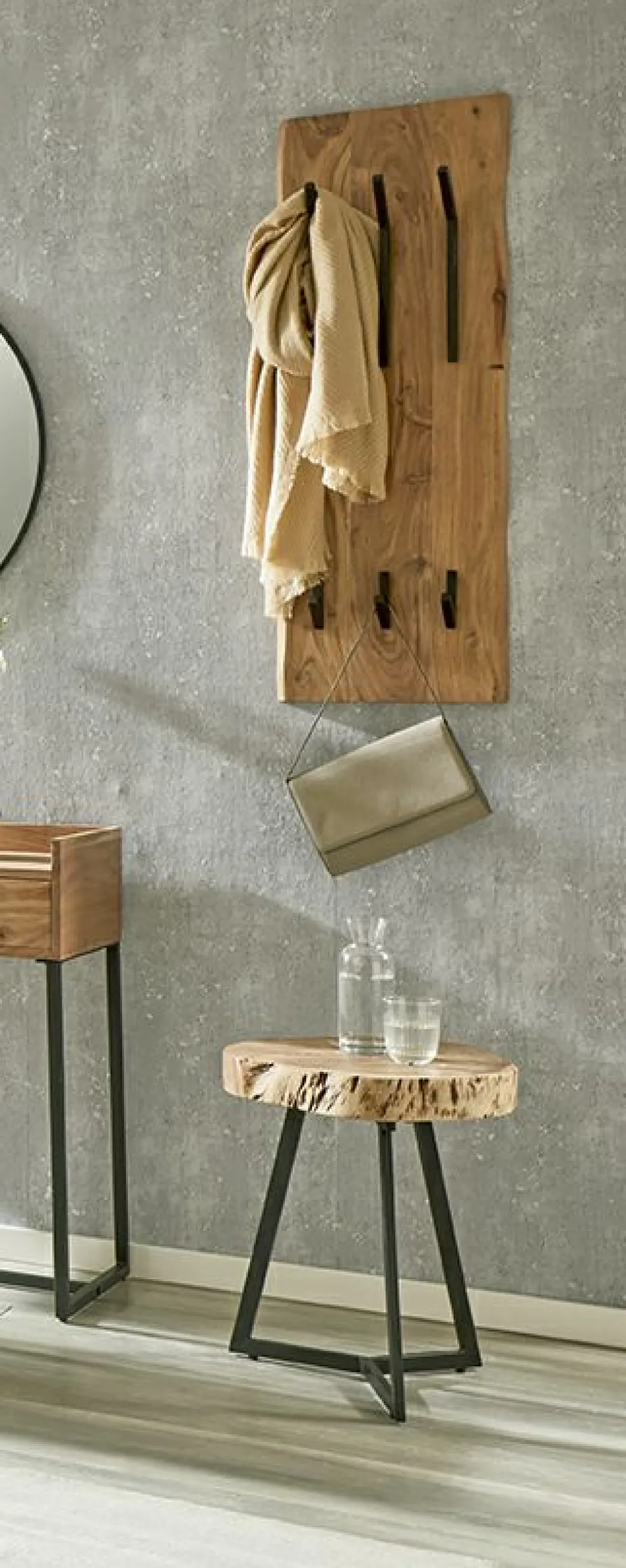en bois d’acacia massif laissé à l’état naturel avec crochets en métal finition époxy ton noir