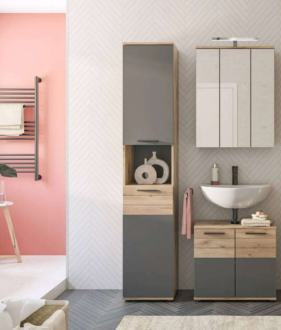 1 colonne de salle de bains avec 2 portes, 2 tablettes amovibles et 1 casier ouvert