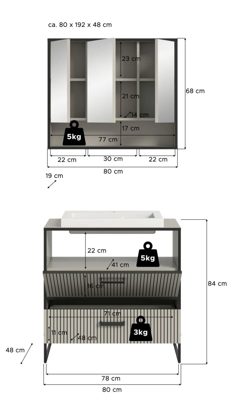 | Meuble sous vasque avec vasque | 80 | 84 | 48 |