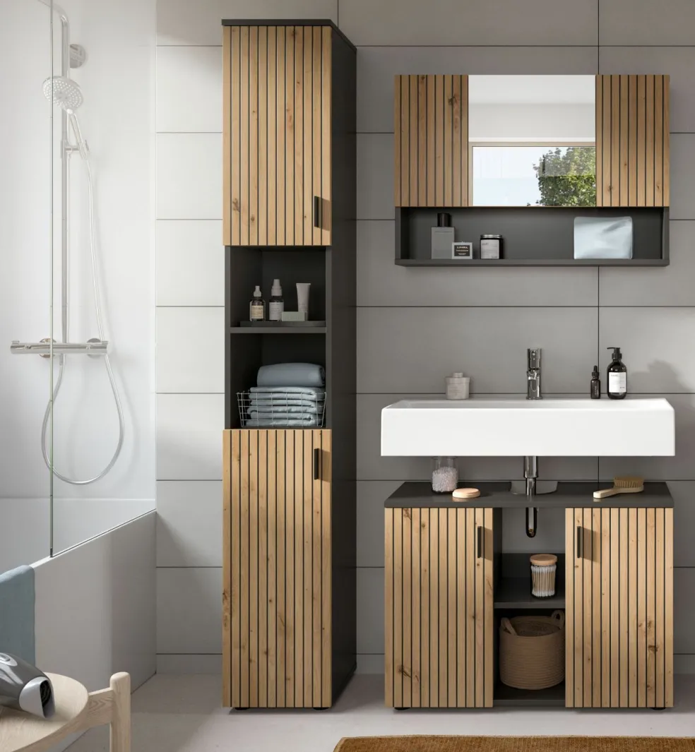 1 colonne de salle de bains avec 2 portes, 3 tablettes amovibles et 2 casiers ouverts