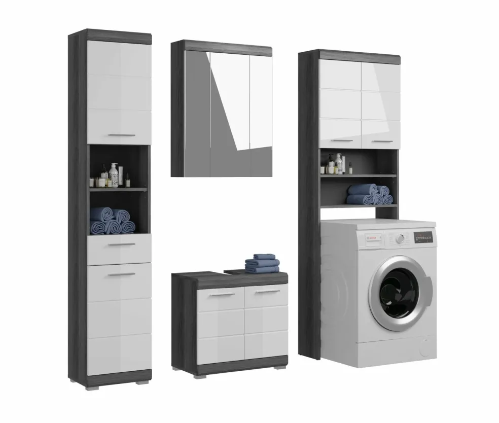 1 meuble pour machine à laver avec 2 portes, 3 tablettes amovibles, 2 casiers ouverts et 2 tablettes fixes