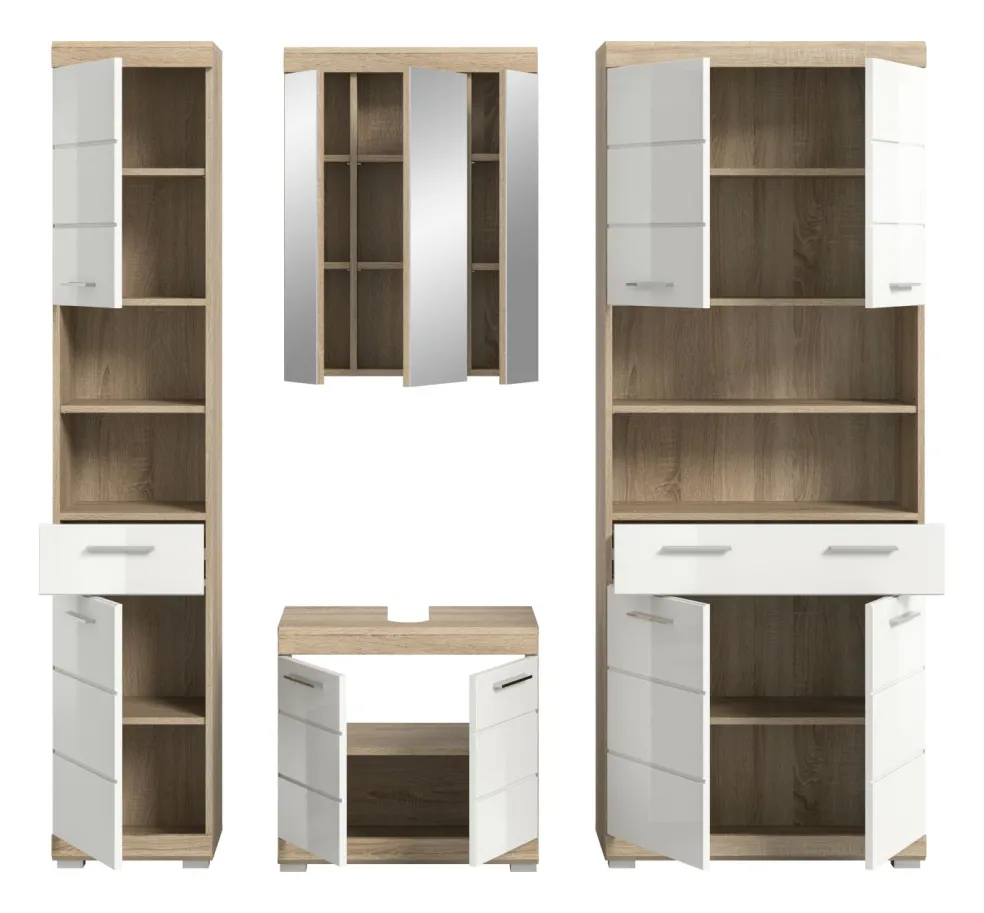 1 colonne de salle de bains avec 2 portes, 1 tiroir, 2 casiers ouverts, 2 tablettes fixes et 3 tablettes amovibles