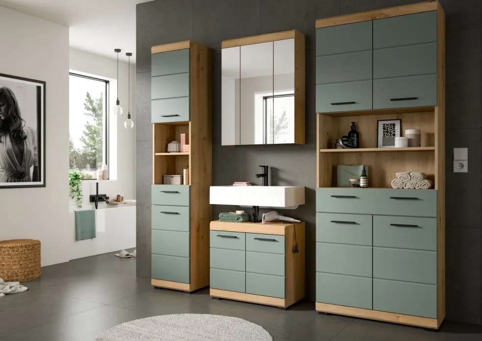 1 colonne de salle de bains avec 2 portes, 1 tiroir, 2 casiers ouverts, 2 tablettes fixes et 3 tablettes amovibles