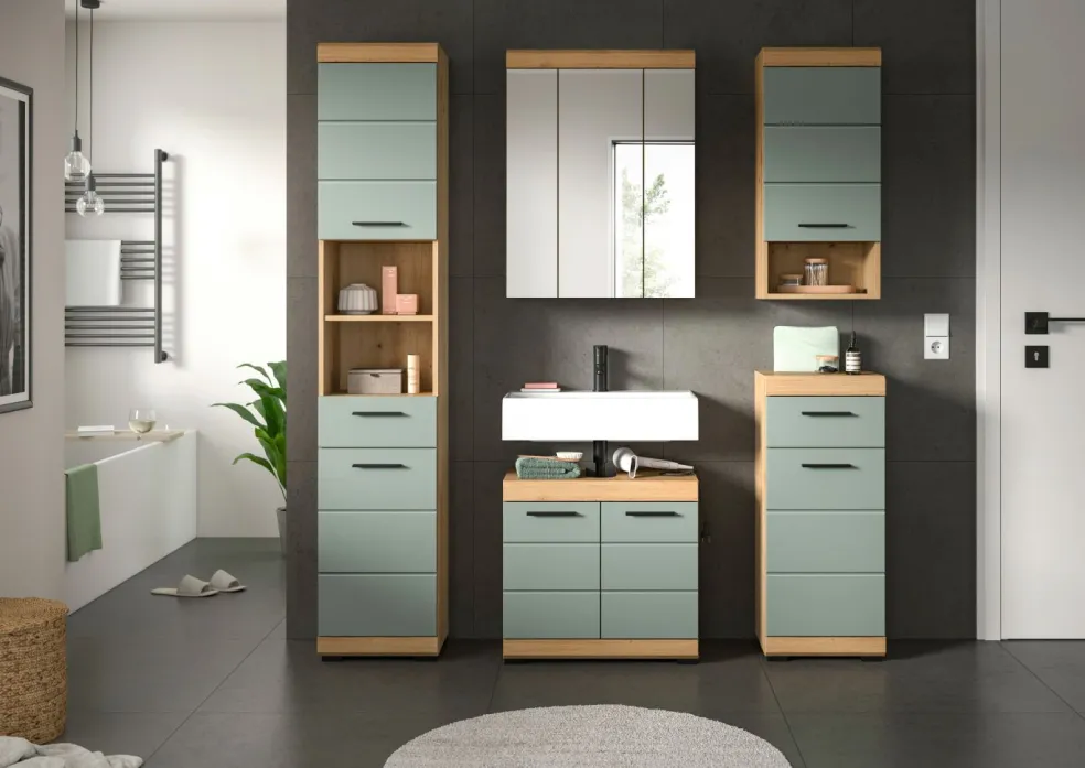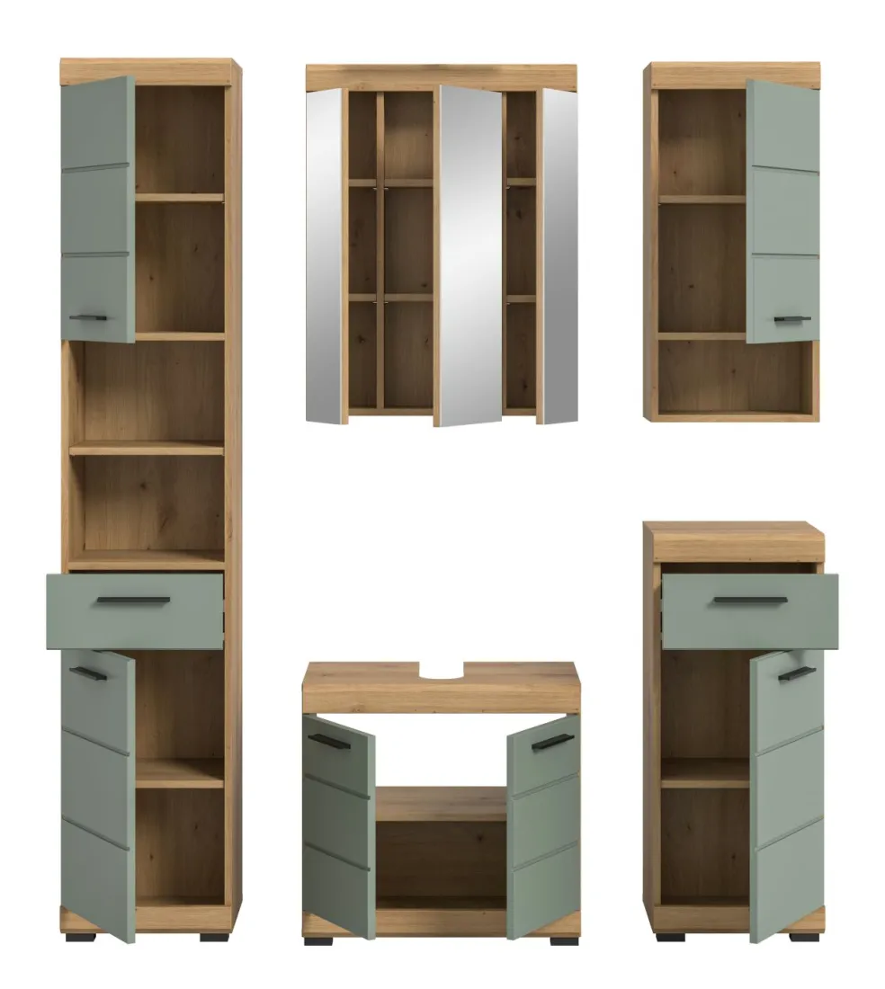 1 colonne de salle de bains avec 2 portes, 1 tiroir, 2 casiers ouverts, 2 tablettes fixes et 3 tablettes amovibles