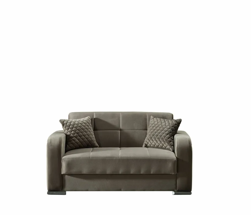 1 canapé 2 places avec coffre de lit et 2 coussins décoratifs