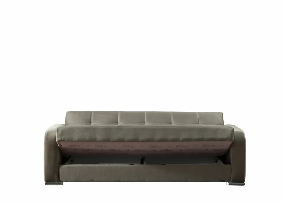 1 canapé 3 places avec coffre de lit et 2 coussins décoratifs