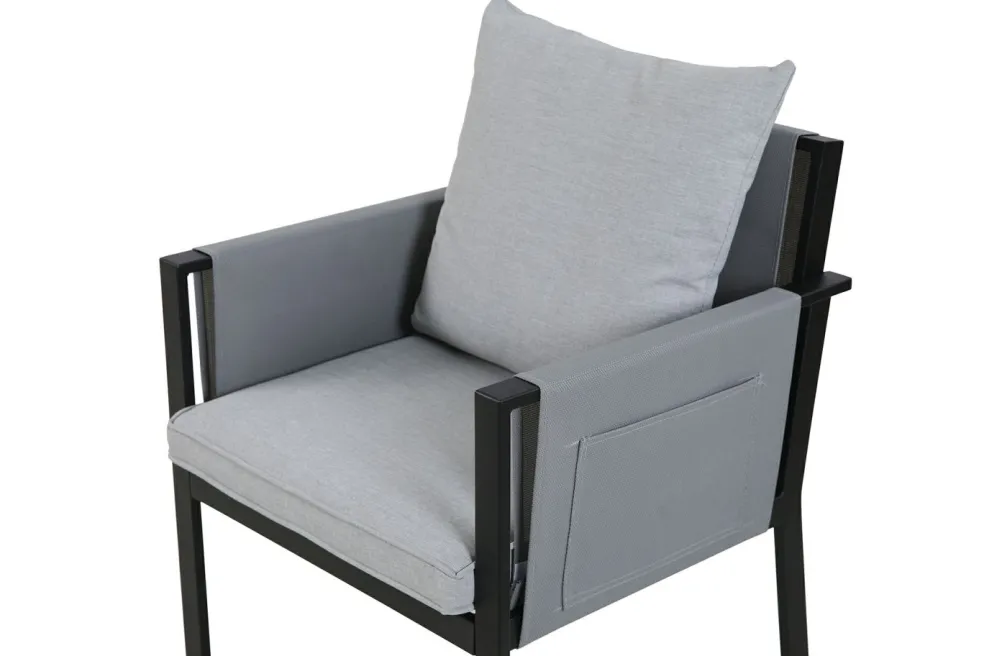 Revêtement des coussins d’assise : oléfine (polyéthylène ou polypropylène) ton gris