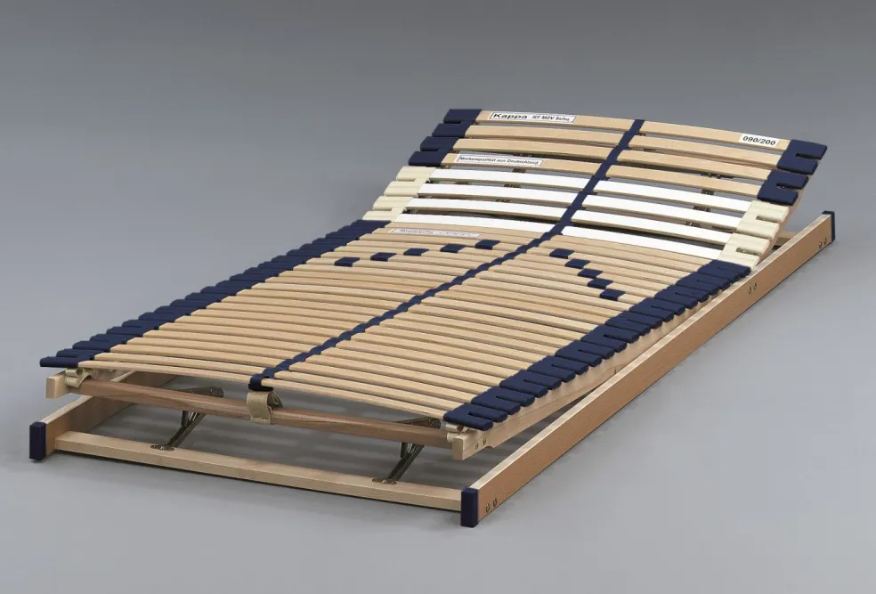 Ce sommier à lattes est très stable et peut supporter jusqu’à env. 120 kg. La tête et le pied de ce modèle sont réglables. Le degré de dureté dans la zone médiane peut être réglé si besoin à l’aide de curseurs. Le cadre de lit KAPPA est adapté à tous les types de matelas habituels et offre une stabilité supplémentaire grâce à la sangle médiane.