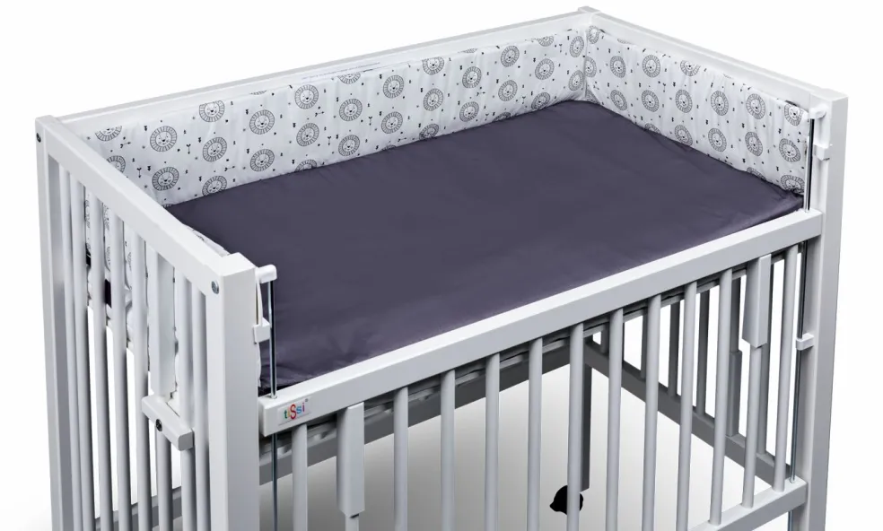 Le tapis moelleux en coton naturel avec garnissage en polyester s’attache aux barreaux du parc grâce aux nouettes.