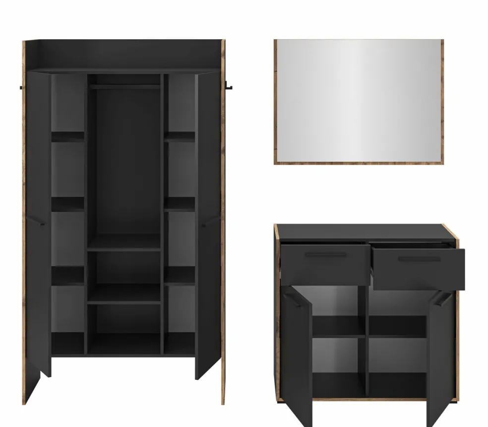 1 armoire de penderie avec 2 portes, 8 tablettes amovibles, 4 casiers ouverts, 1 barre de penderie et 2 crochets à vêtements