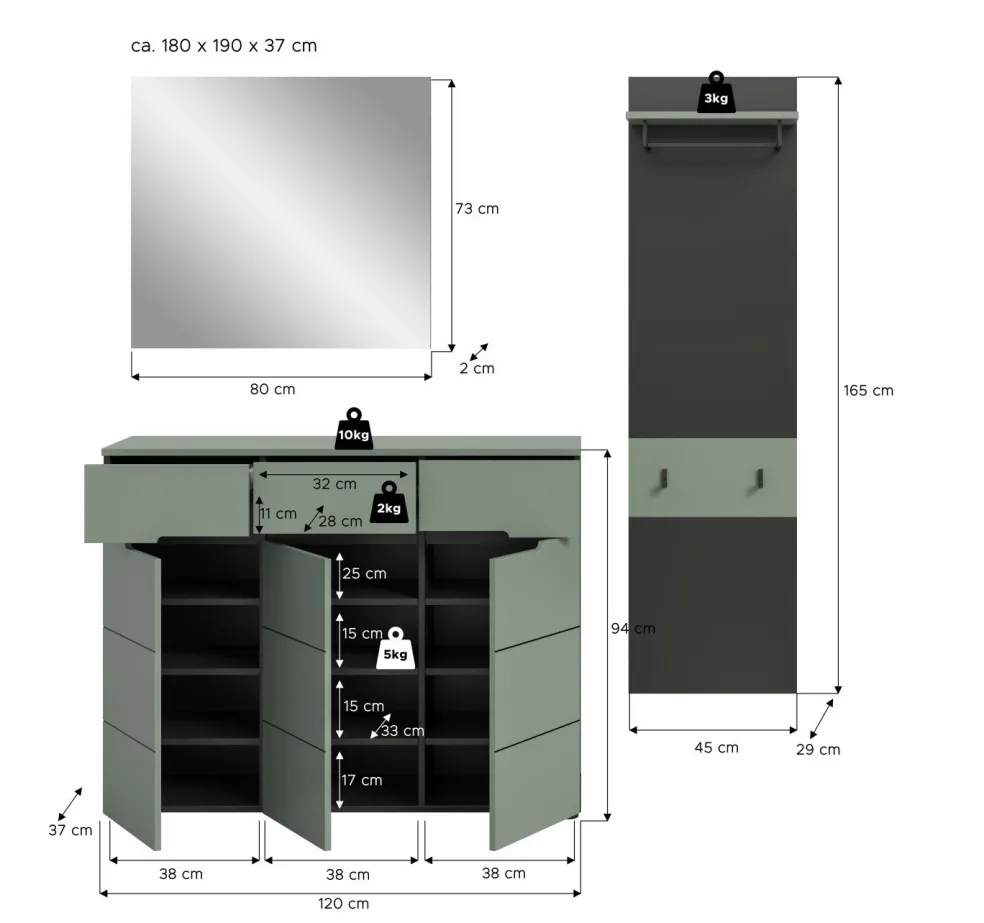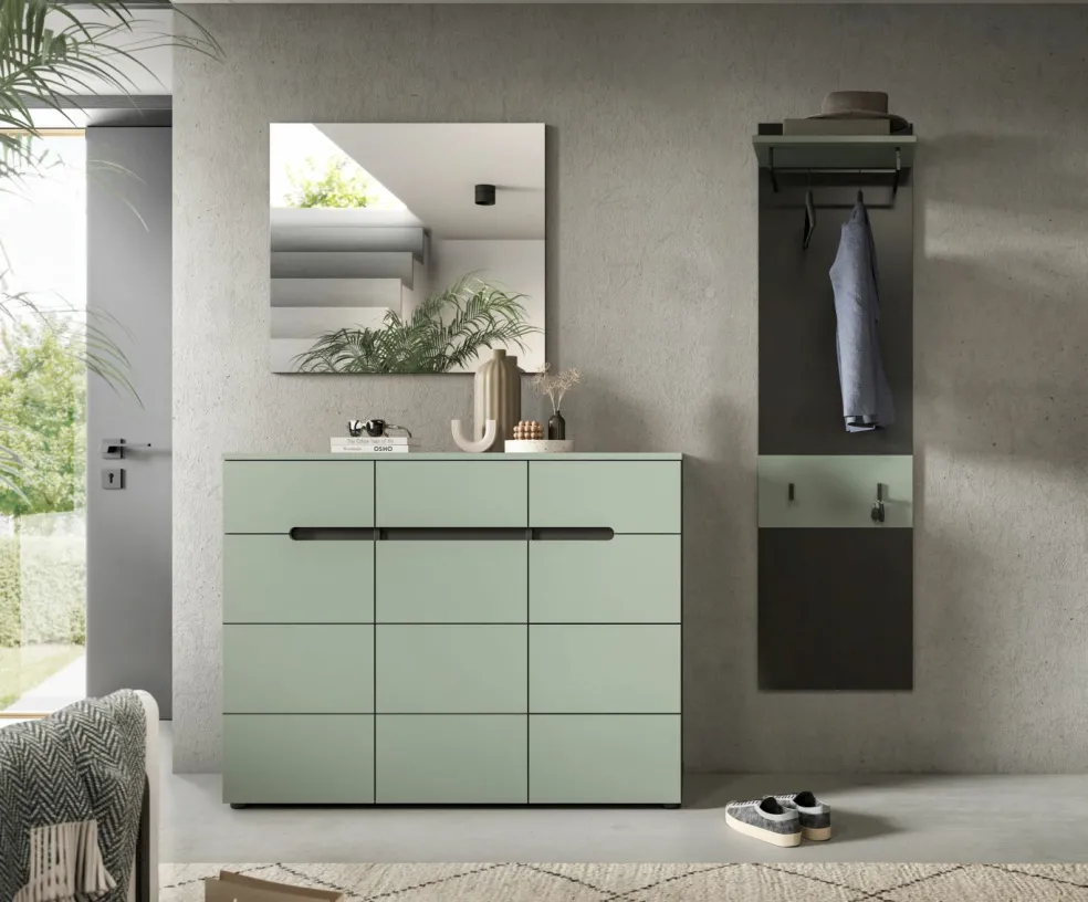 1 meuble à chaussures avec 3 portes, 3 tiroirs et 9 tablettes amovibles