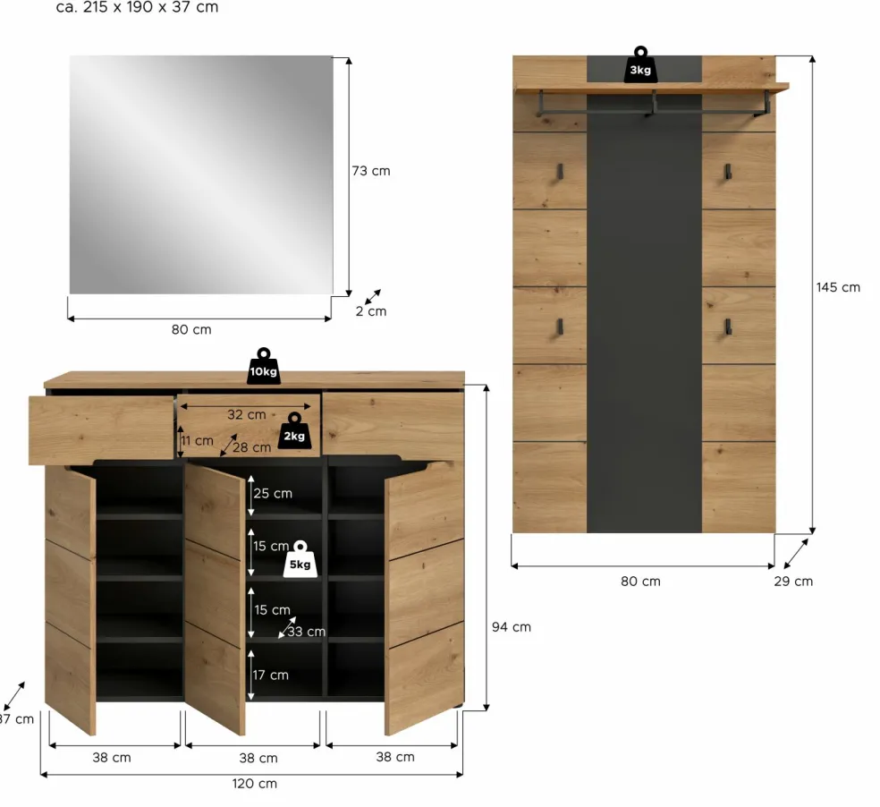 | Dimensions : | L/H/P env. 215/190/37 cm | ||