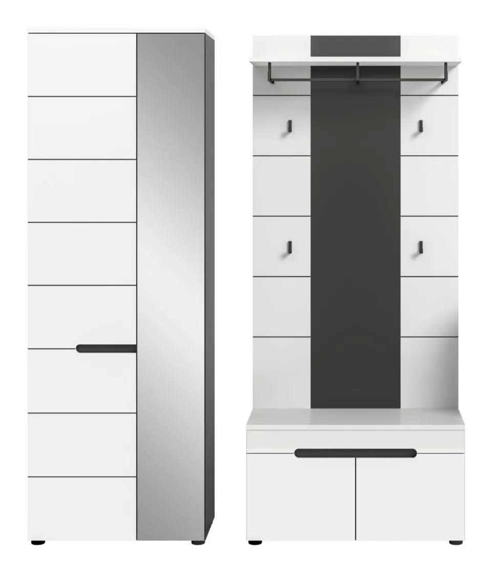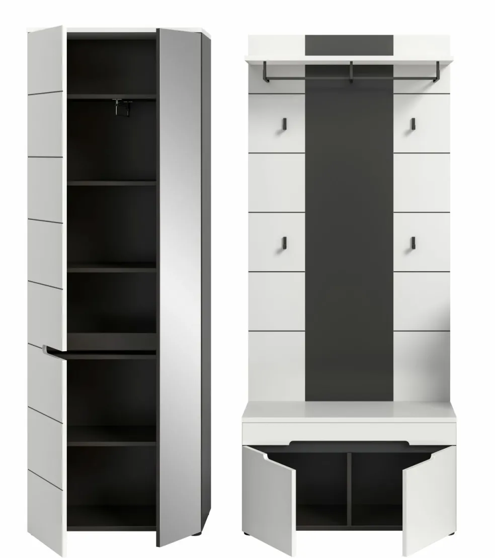 1 armoire d’entrée avec 2 portes (dont 1 porte avec miroir), 1 tablette fixe, 1 barre de penderie et 4 tablettes amovibles