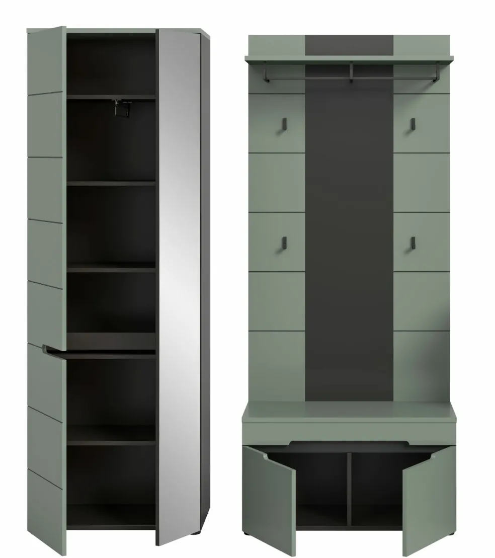 1 armoire d’entrée avec 2 portes (dont 1 porte avec miroir), 1 tablette fixe, 1 barre de penderie et 4 tablettes amovibles