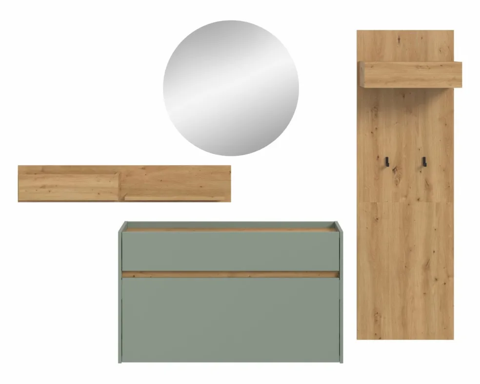 Façade: ton sauge et décor chêne Artisan / miroir