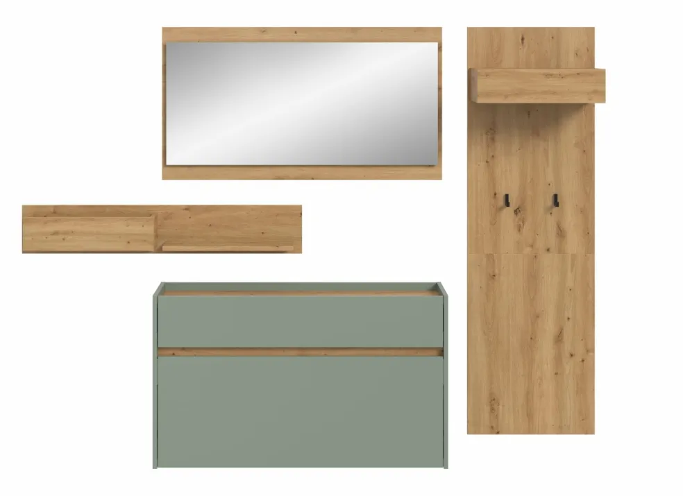 Façade: ton sauge et décor chêne Artisan / miroir