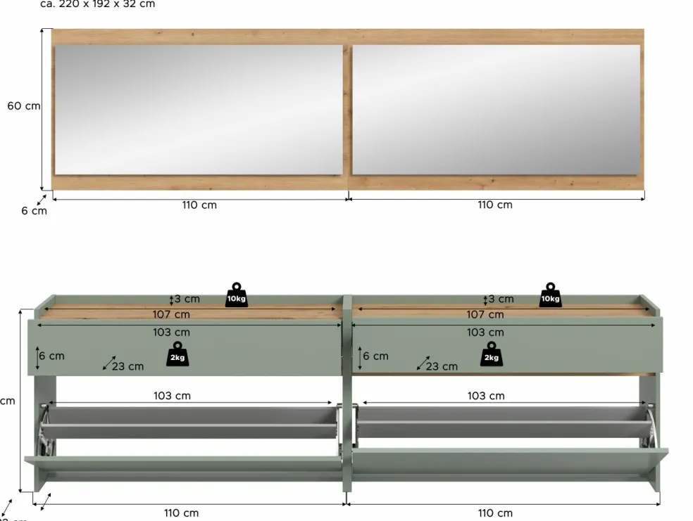 2 meubles à chaussures avec, chacun, 1 tiroir, 1 abattant et 1 rangement pour chaussures, à suspendre
