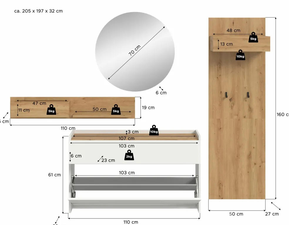 1 meuble à chaussures avec 1 tiroir, 1 abattant et 1 rangement pour chaussures, à suspendre