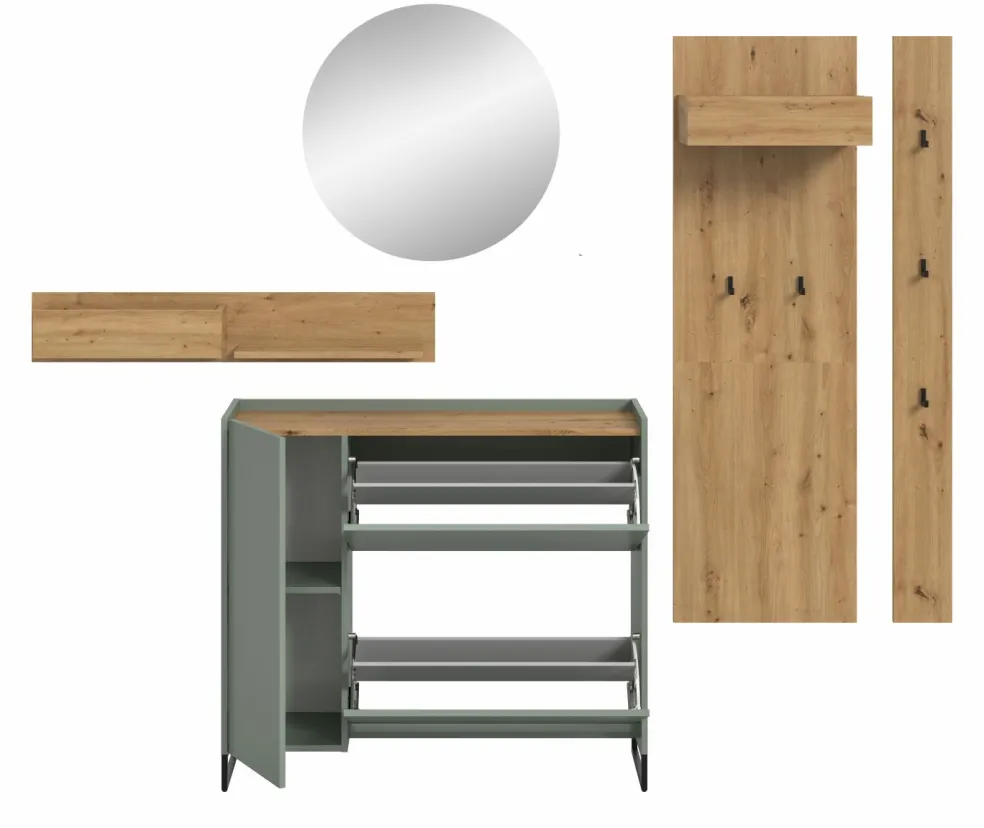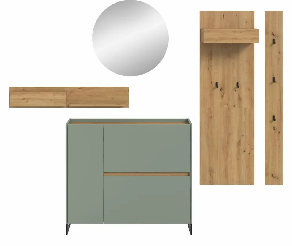 Façade: ton sauge et décor chêne Artisan / miroir