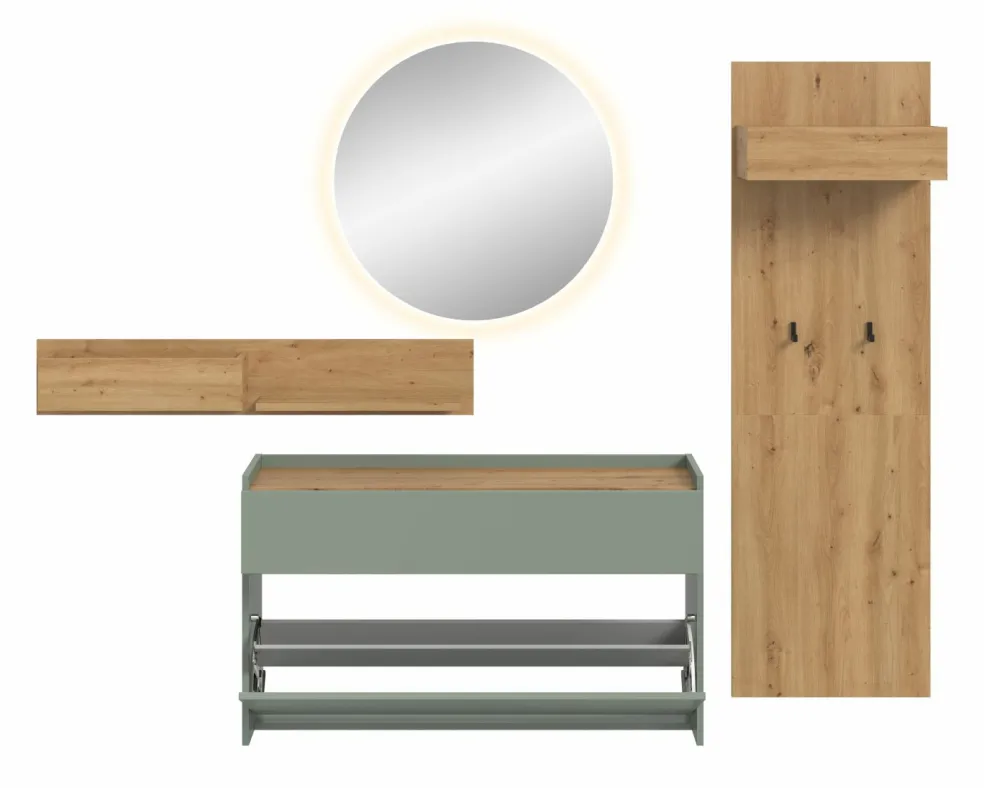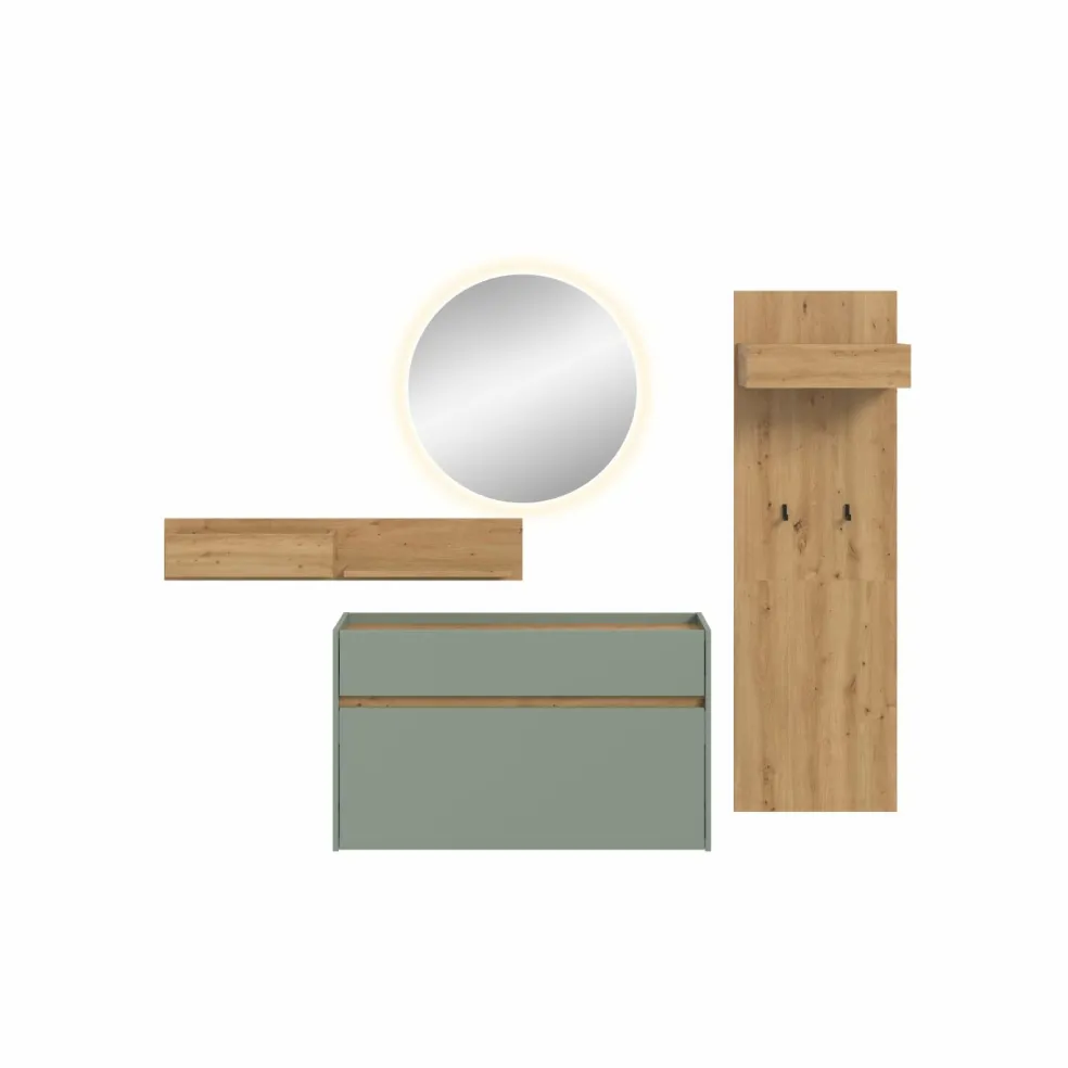 Façade: ton sauge et décor chêne Artisan / miroir