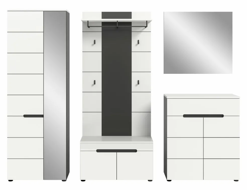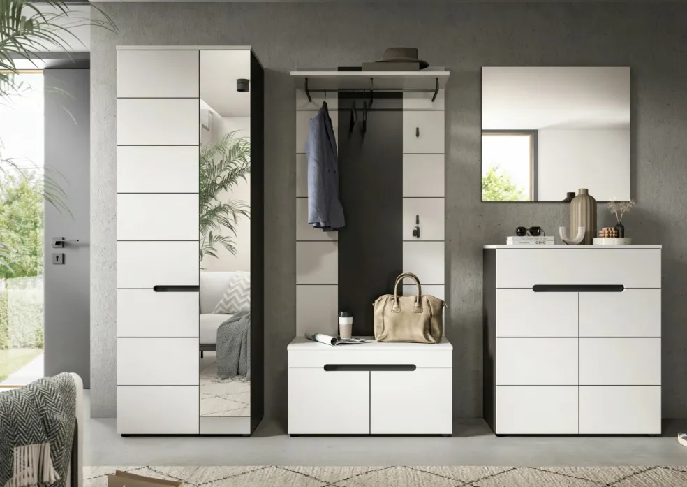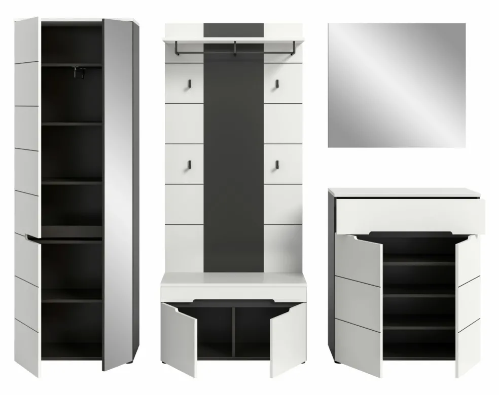 1 armoire d’entrée avec 2 portes (dont 1 porte avec miroir), 1 tablette fixe, 1 barre de penderie et 4 tablettes amovibles