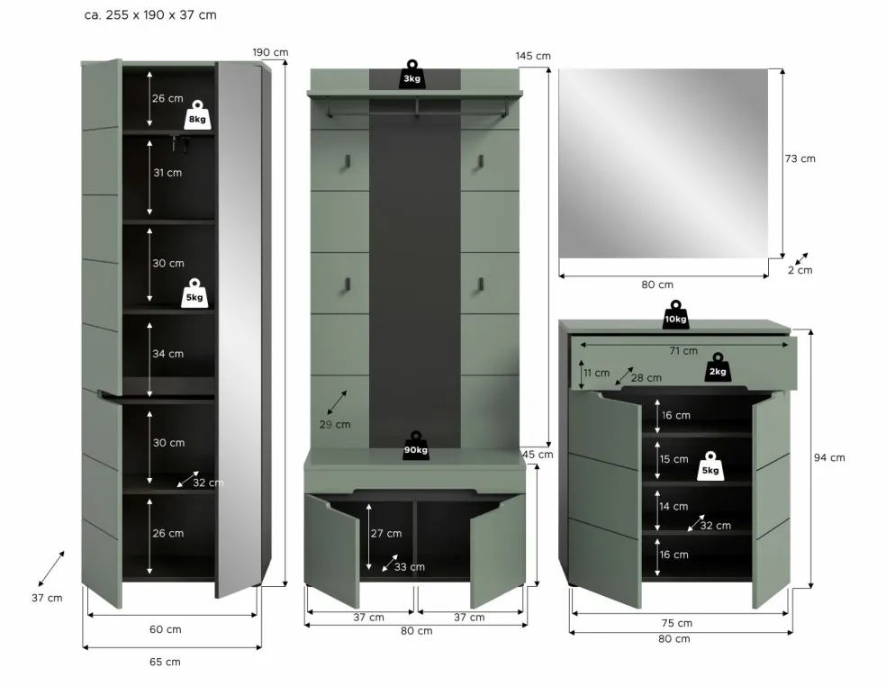 1 armoire d’entrée avec 2 portes (dont 1 porte avec miroir), 1 tablette fixe, 1 barre de penderie et 4 tablettes amovibles