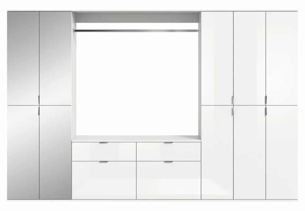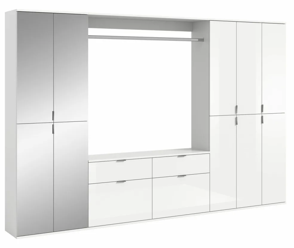 1 armoire d’entrée comprenant 2 portes ton blanc ultra brillant, 7 tablettes amovibles, 1 tablette fixe et 1 barre de penderie